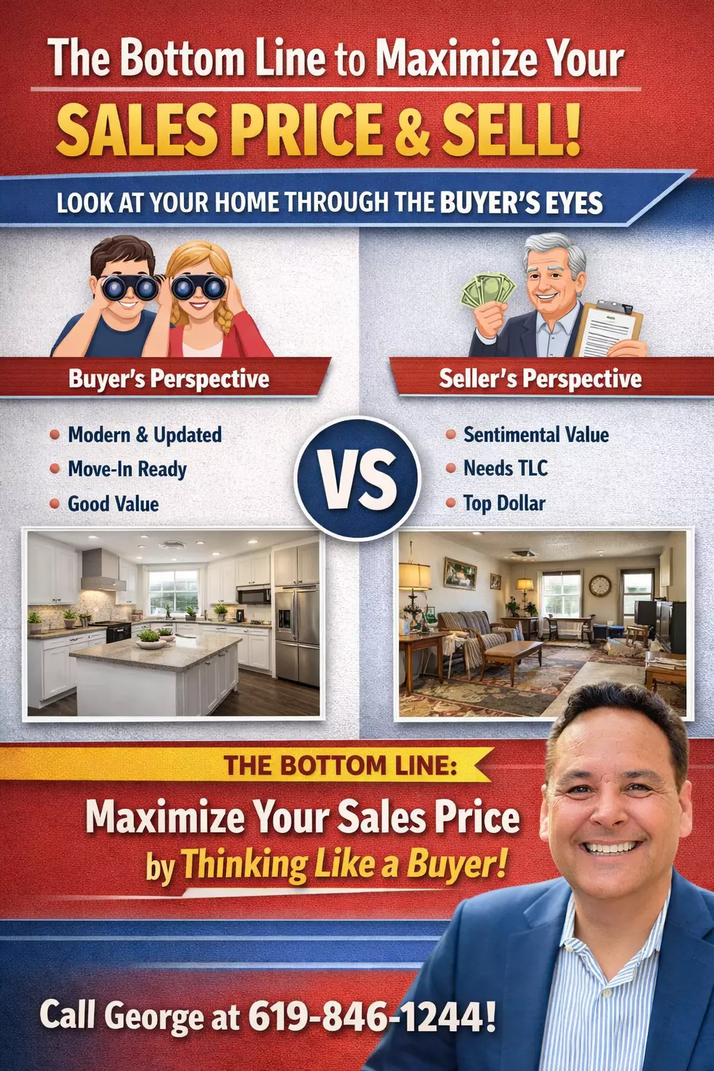 How to avoid the first mistake that San Diego home sellers makeIf you’ve been wondering what's going on in the San Diego housing market, here’s a quick reality check: The reason I tell you this is that there's an opportunity to buy at a good deal in this market. And if you're thinking of selling, don't price your home speculatively. For example, these speculative sellers say things like, "If I could get this price, I'd sell." (usually "their price" is higher than today's market value). For buyers, it becomes clear that the price may or may not have been based on today's statistics. For sellers, it's evident that unless you price it right, you may not sell. Here's my simple 3-step strategy that's helped over 1,000 sellers. 1) Determine that you are committed to selling. 2) Then price your home against competing listings, the homes buyers are comparing yours to. 3) Listen to feedback from the market and buyers and implement changes. Do this right, and you create urgency, competition, and the best chance of selling for top dollar. Call or text me, George, at 619-846-1244 to get your Complimentary Home Seller Report. All the best, George Lorimer Secret selling options that other agents don't offer.